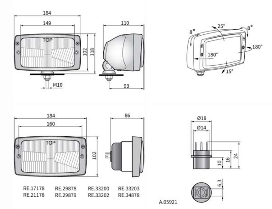 Особенно рекомендуются для тракторов и тихоходных автотранспортных средств. Предназначены для монтажа в фабрично приспособленных местах или для установки в передних нишах автомобиля. Фары в версии с корпусом устанавливаются на кузове в стоячем положении при помощи болта М10. Знак официального утверждения Е20 касается фар оснащенных лампами H4 а знак Е8 лампами R2. Части полезные при монтаже: пыльник главной лампы - кат. № A.05820 патрон лампы габаритного огня - кат. № A.05921 модульное соединение главной лампы - кат. № A.07128 Рекомендуемое использование: A - тракторы: Zetor, Zetor Forterra, Zetor Proxima, Fendt, Fendt Farmer, Fendt Favorit, Ursus, Pronar, John Deere, Farmer, Farmtrac B - тихоходные транспортные средства: Ammann, Div, Doosan, Hamm, Hyundai C - тракторы: Zetor: Proxima i Forterra
