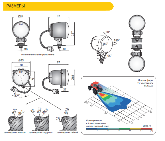 Фары в версии с кронштейном устанавливается на автомобиле как в стоячем, так и в висячем положении.