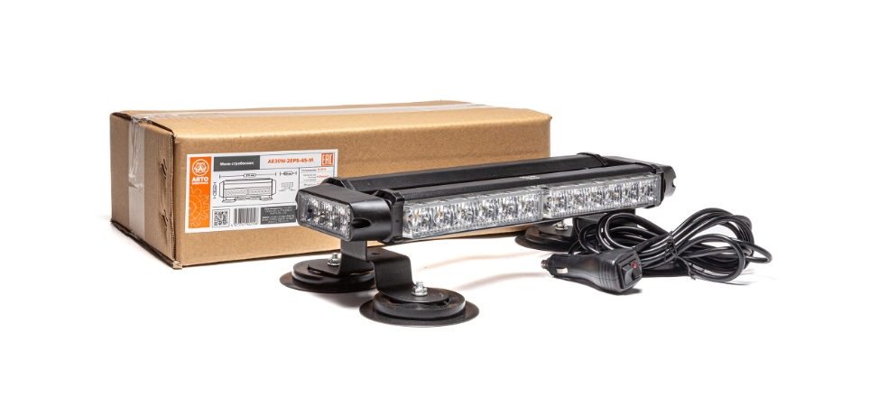 Маяк-стробоскоп 12/24 В, 30 Вт, 4-стор. (2+2+2 блока Epistar), 13 реж., крепление на магните, прикуриватель (провод 3м), 310*120*78 мм