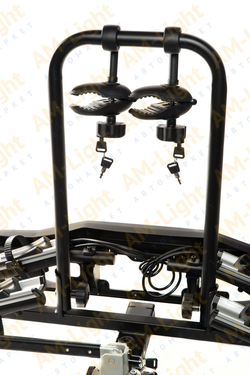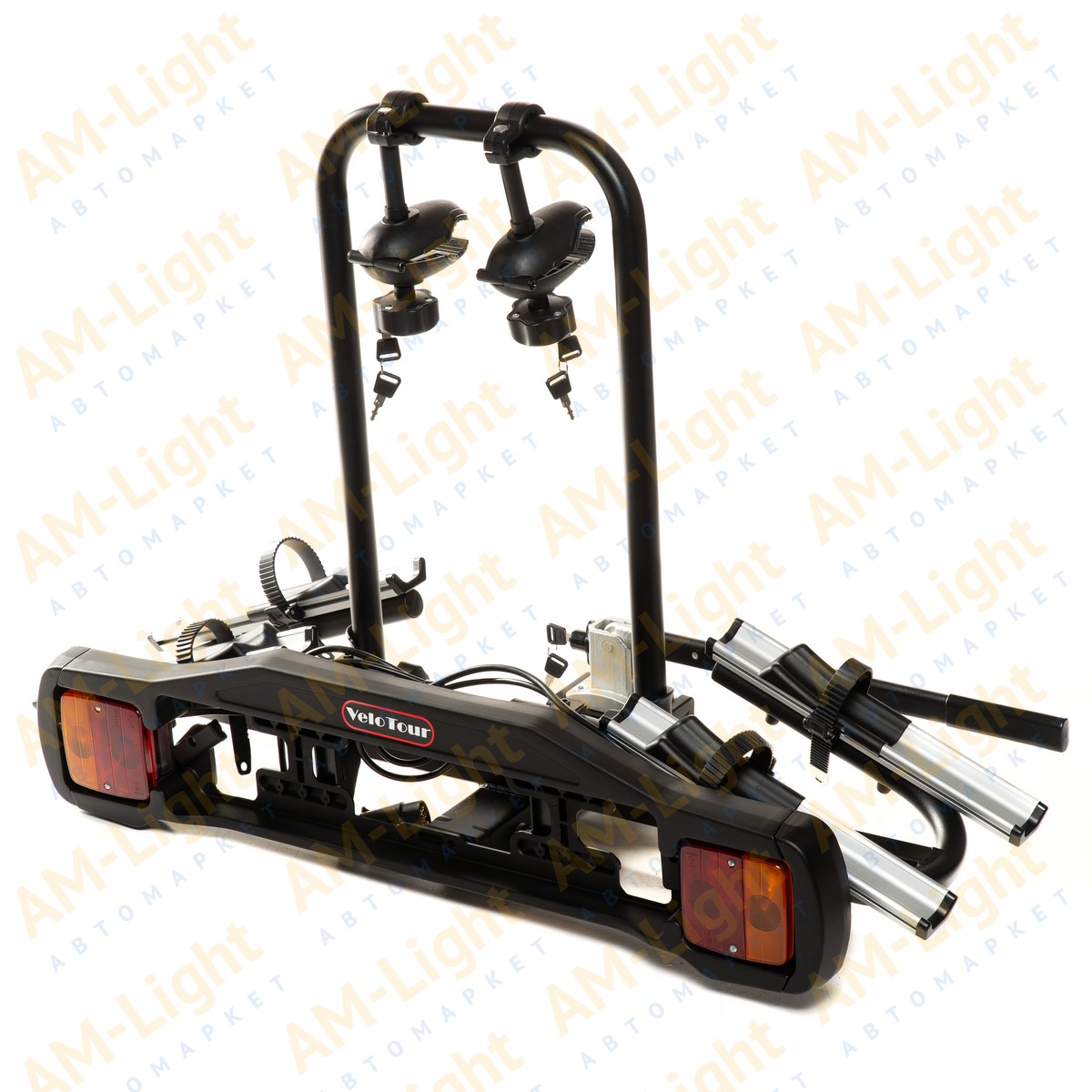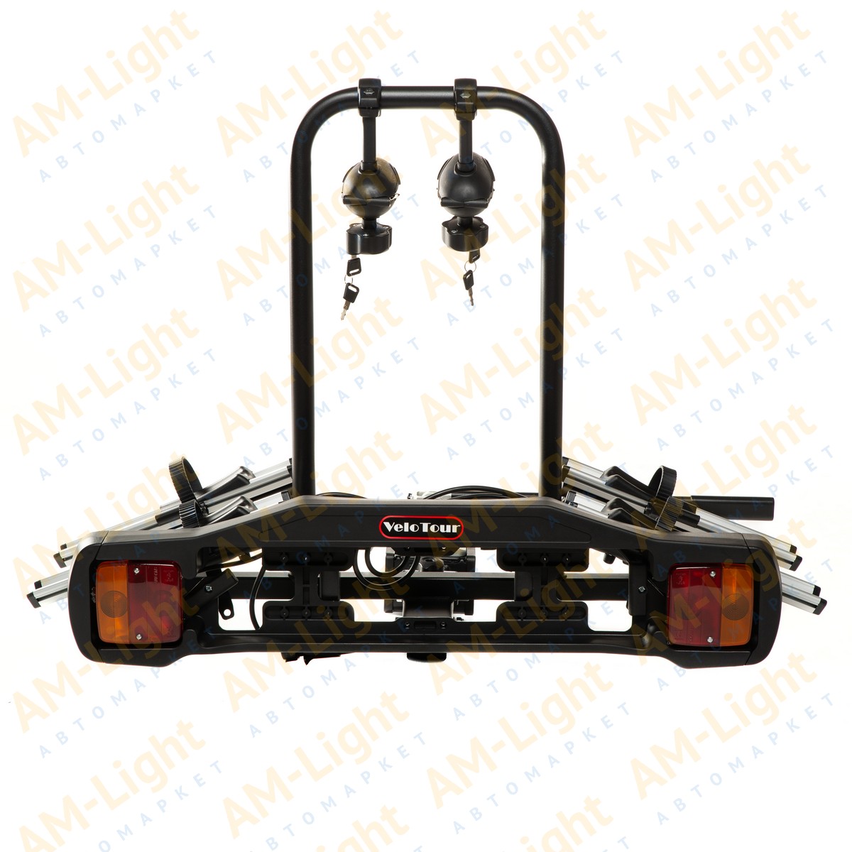 Багажник предназначен для перевозки 2-х байков общим весом до 30 кг предусмотрена возможность регулировки ложементов под колеса. Крепление на шаре дополнительно запирается на ключ. Штанга-держатель откидывается, что облегчает хранение и перевозку. Велокрепление VeloTour Kraken 2 снабжено дублирующими габаритными огнями и площадкой под номерной знак, что позволяет перевозить спортивное снаряжение без нарушения ПДД. Разъем розетки под электрику 7 pin.